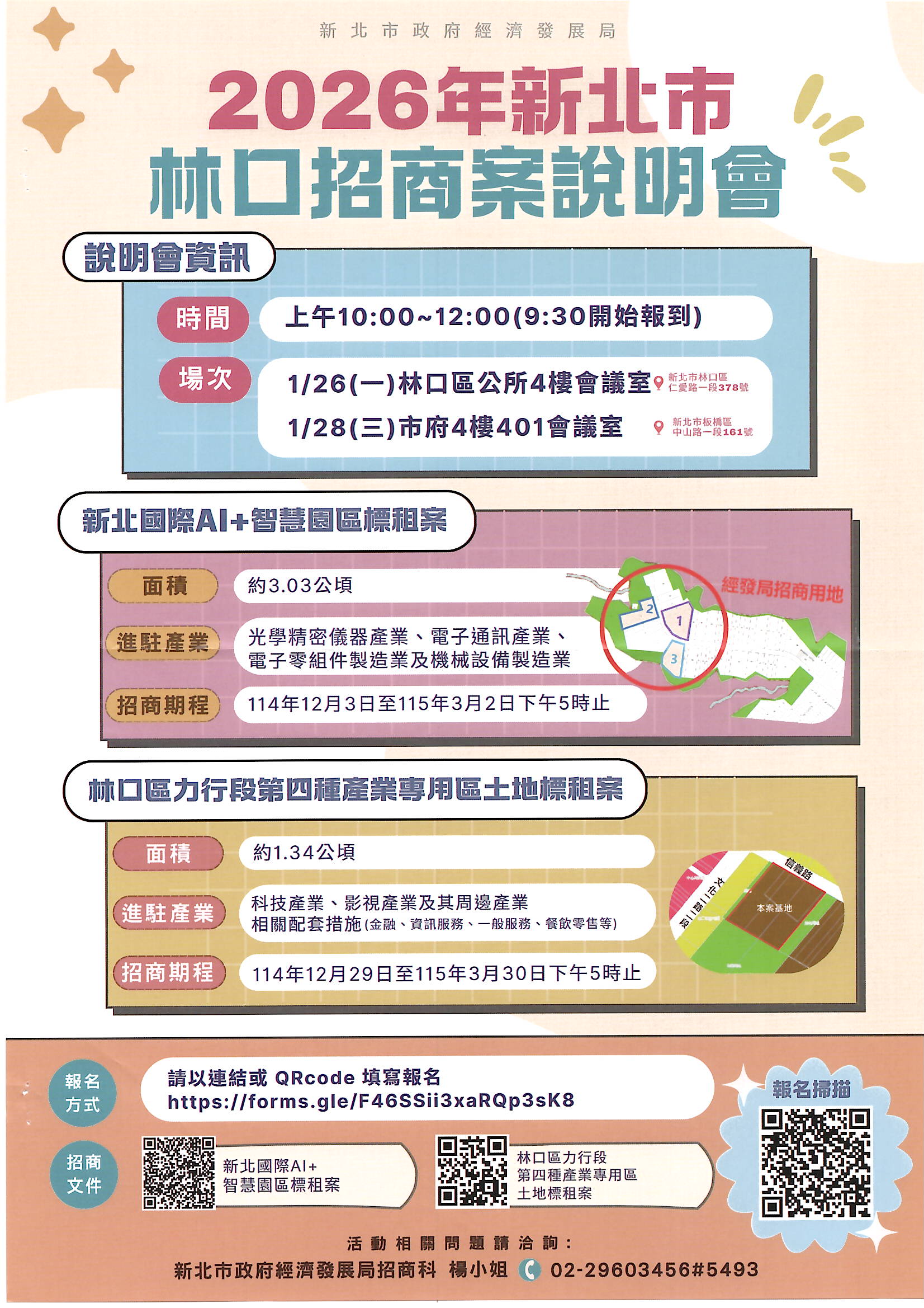 新北市政府經濟發展局辦理「新北國際AI+智慧園區招商案公開標租案」及「林口區力行段第四種產業專用區土地標租案」招商,相關說明如下: